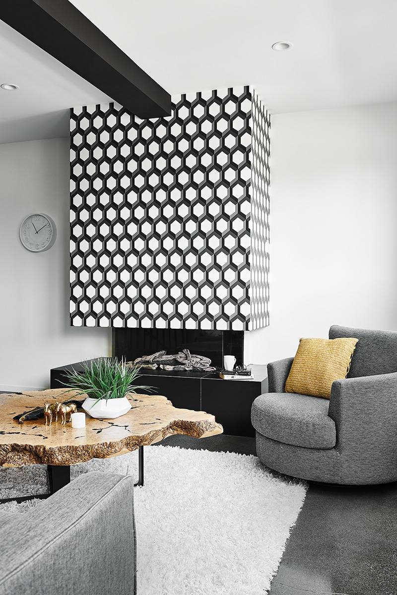 Decorating + Design Statement Fireplace Plays With Geometry Danisha Drury of Design District Access used a timeless black-and-white geometric element for this modern fireplace.
