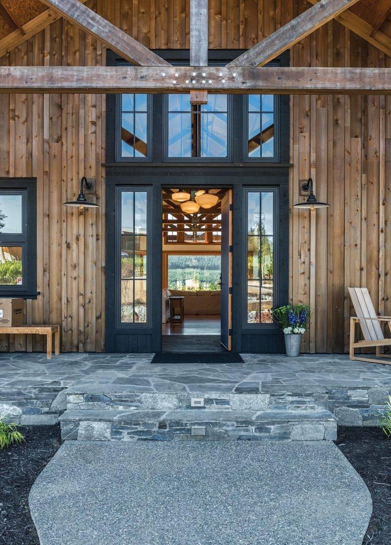 It sits almost overtop the vineyard, surrounded by grapes, snugged into a Mediterranean microclimate where summer temperatures reach past 35 degrees. It’s only steps down from the winery’s rather magnificent new tasting room, which was designed by architect Joe Chauncey of Seattle’s Boxwood. Chauncey consulted on the vaulted ceiling trusses in the residence and other tied elements — the buildings play off each other with a generous use of fir, similar oversized blue grouse-coloured entrance doors (the colour of the bird’s tail feathers), and numerous French doors open to expansive decks.