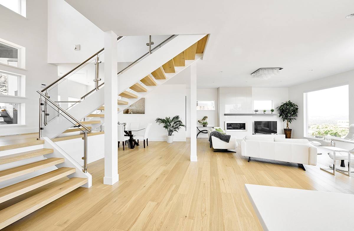 Part of the magic of this home comes from the views that greet onlookers at every level. The open-concept living and dining room is one of the most stunning areas of the house, with a floating staircase acting as the architectural centrepiece. White oak floors in Lynn Canyon from Goodfellow’s San Marino collection brighten the house while keeping things modern with a matte finish.