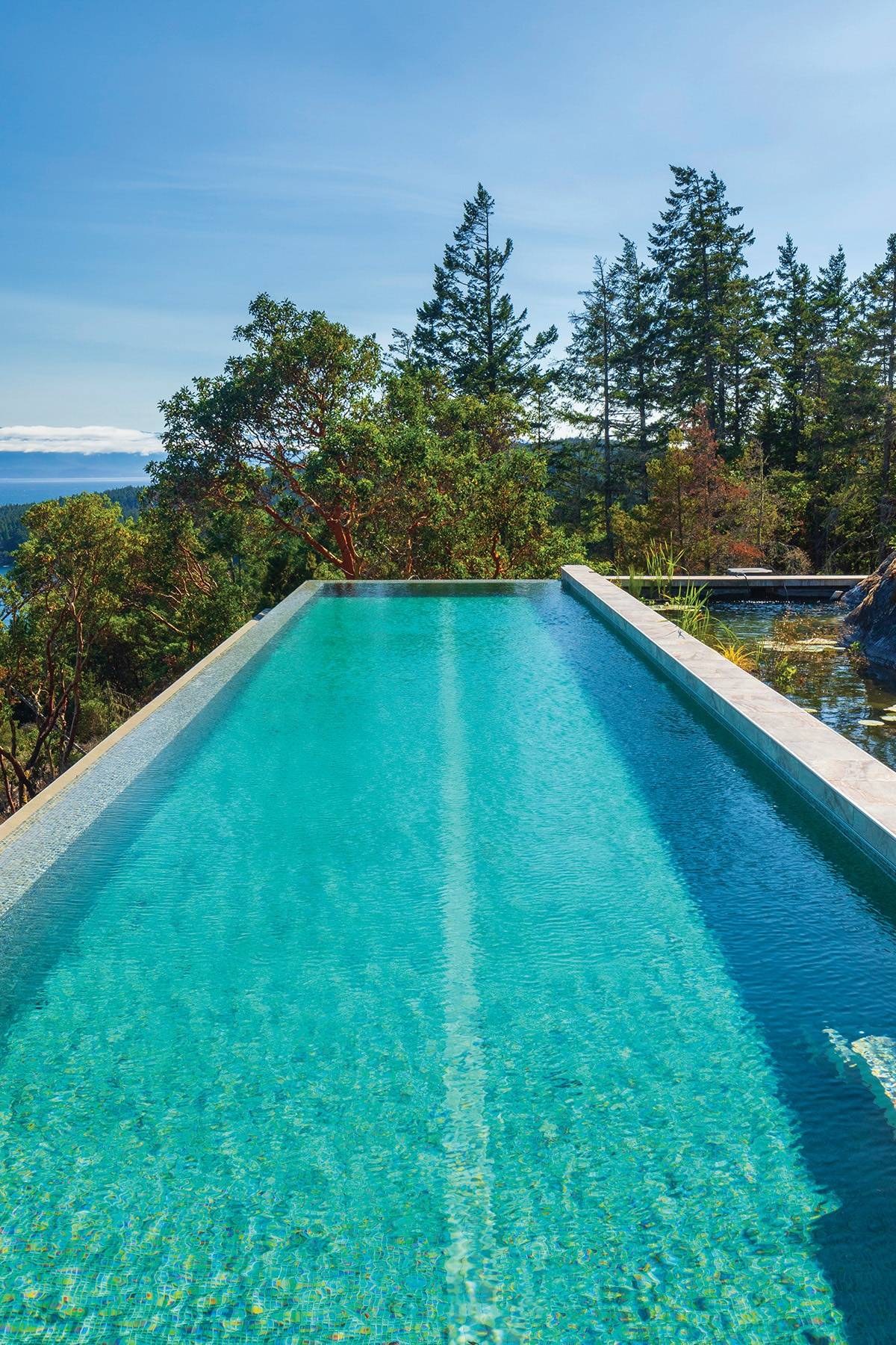 A waterfall cascades down a large rock outcrop, wrapping around the koi pond and the infinity edge lap pool, which overlooks a rare arbutus forest across to the Olympic Mountains.
